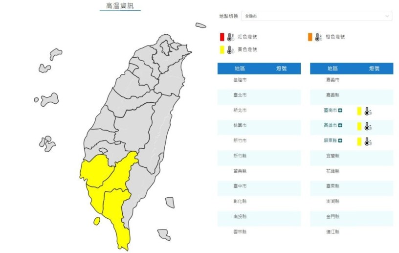 中央氣象局今日上午發布新聞稿指出,天氣晴朗炎熱,提醒民眾臺南市、高雄市、屏東縣地區於今日中午前後為黃色燈號,請注意防範。