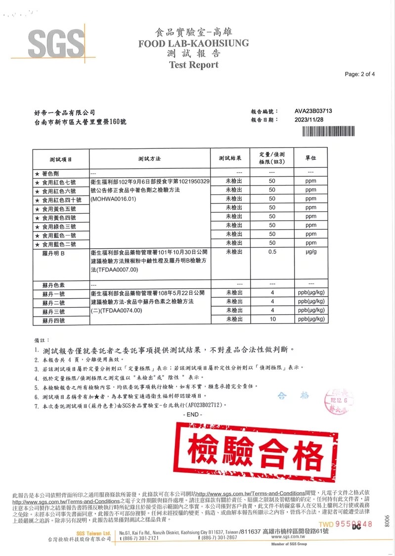 (四) 特此說明,本公司產品未使用到蘇丹紅辣椒粉,全數產品安全無虞。