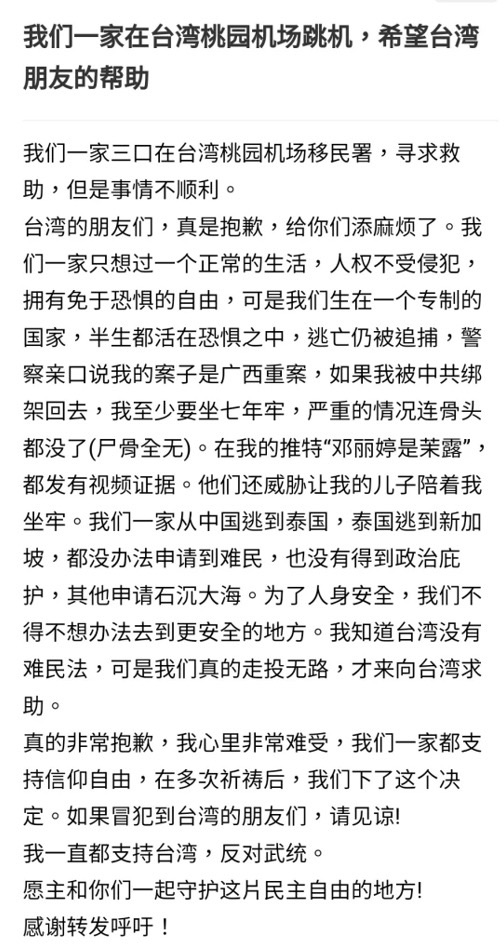 他們表示,深知臺灣還沒有難民法,並對於向臺灣提出的庇護請求感到非常抱歉。但是因為走投無路,他們懇請臺灣政府和社會提供幫助,讓他們一家人得以免於被迫遣返回國所面臨的可怕命運。
