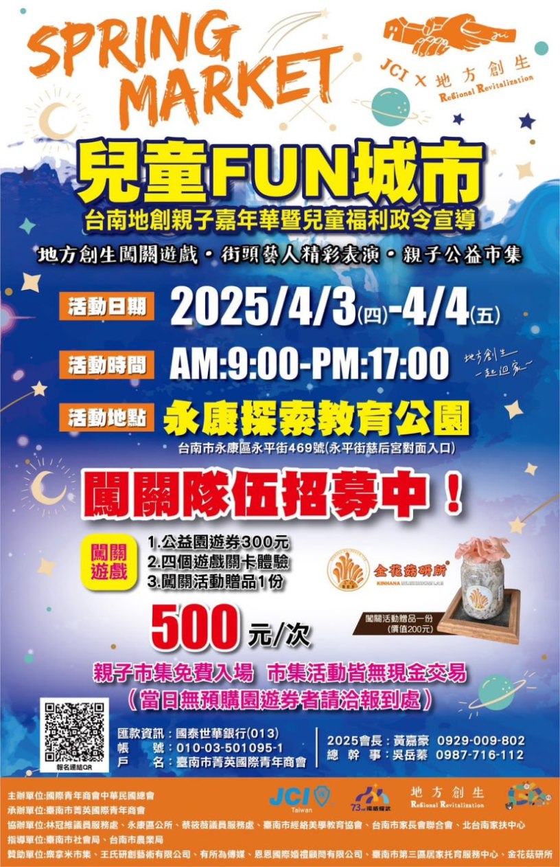 這場融合「教育、文化、公益」的親子嘉年華,將為大小朋友帶來難忘的春日體驗。誠摯邀請所有親子家庭、好友組隊參與,一起在台南探索、挑戰、玩樂,FUN享城市魅力!