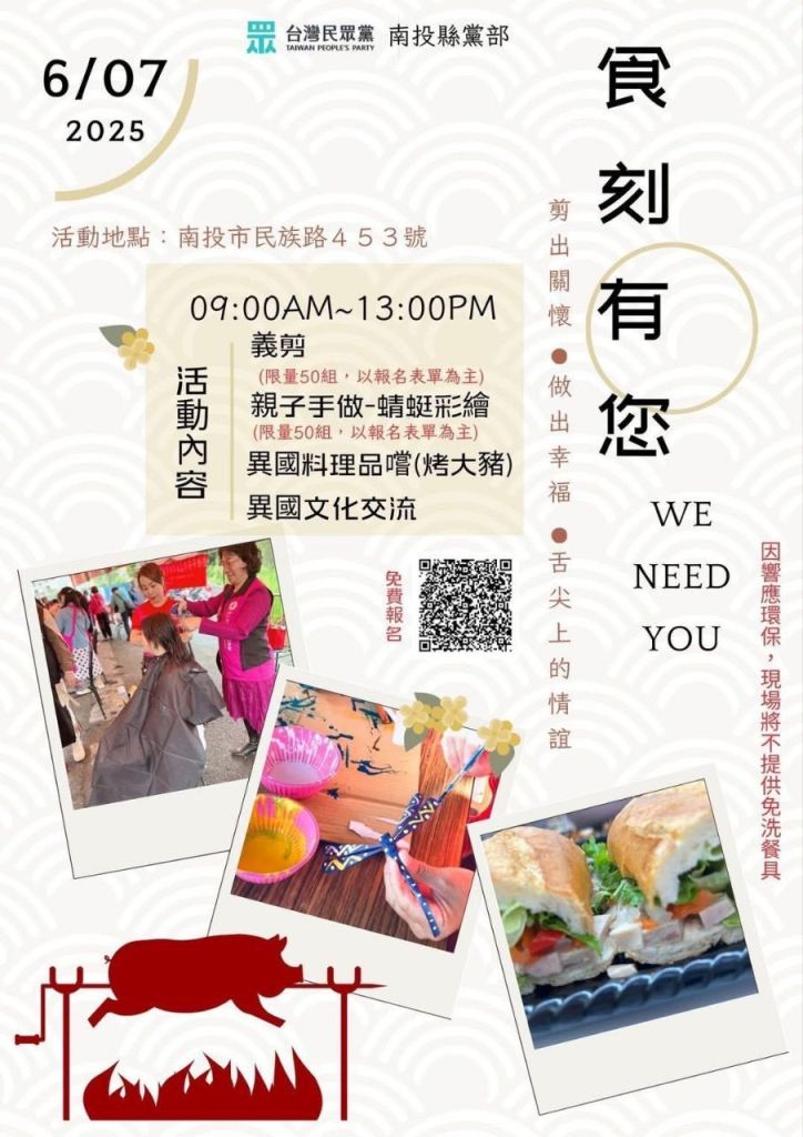 為深化在地服務精神與促進地方文化交流,台灣民眾黨南投縣黨部將於2025年6月7日(星期六)上午9時至13時,在南投市民族路453號舉辦「食刻有您 藝文交流暨主委交接典禮」,本次活動旨在推動社區參與、文化融合,展現民眾黨的公共參與精神,同時邀請所有鄉親踴躍共襄盛舉。
